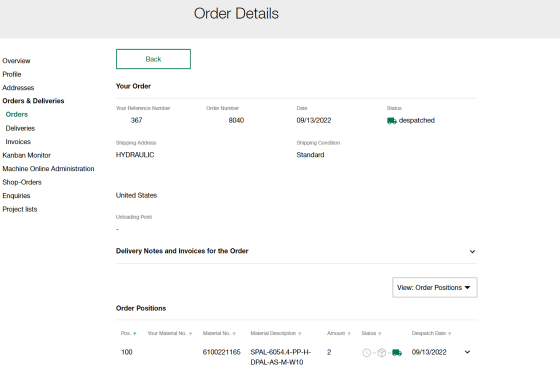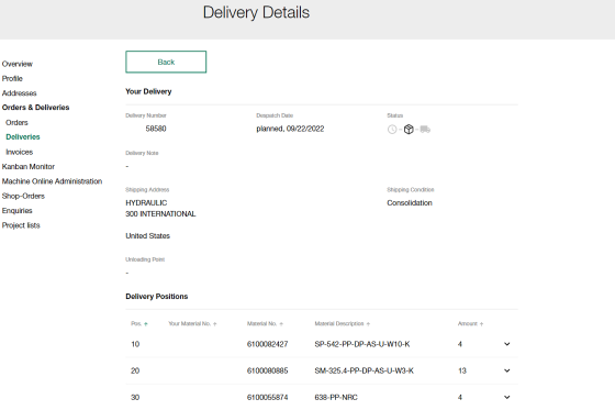 - Para pedidos entregados: Fecha de envío, número de albarán de entrega, número de seguimiento