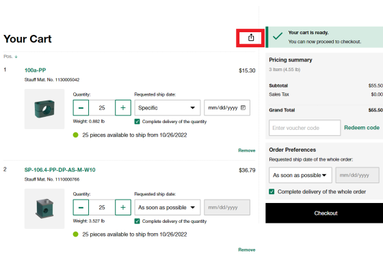 - Haga clic en el botón de compartir para enviar todo el carro de compra por enlace